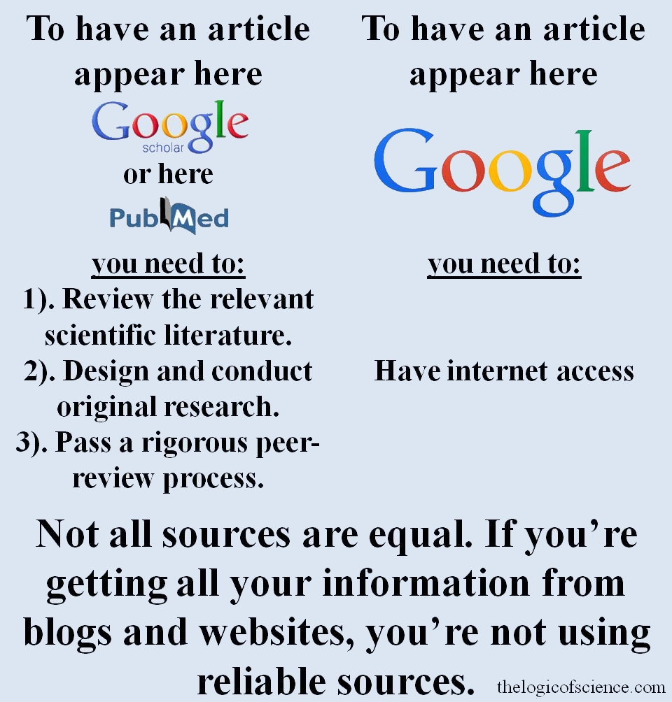 Finally, yes, the peer-review system is not perfect. No one is saying that it is an infallible system, but it is a good system, and it’s better than the alternative. To those of you who insist on trusting blogs rather than the peer-reviewed literature, think about the difference in what it takes to publish via each medium. Scientific papers are evaluated by numerous different experts before they are published, a huge number of papers never get published, and even after being published, papers can be retracted if flaws in them are found. In contrast, blogs are reviewed by no one, and at worst, someone might troll you. So which one do you actually think is more trustworthy: an admittedly imperfect review system that still manages to block a tremendous amount of bad research and ensure high quality in the majority of published papers, or a complete and total lack of review in which absolutely any piece of garbage can be published? The peer-review system may not be perfect, but it’s the best we have, and it’s still several orders of magnitude better than blogs (or Youtube videos).
