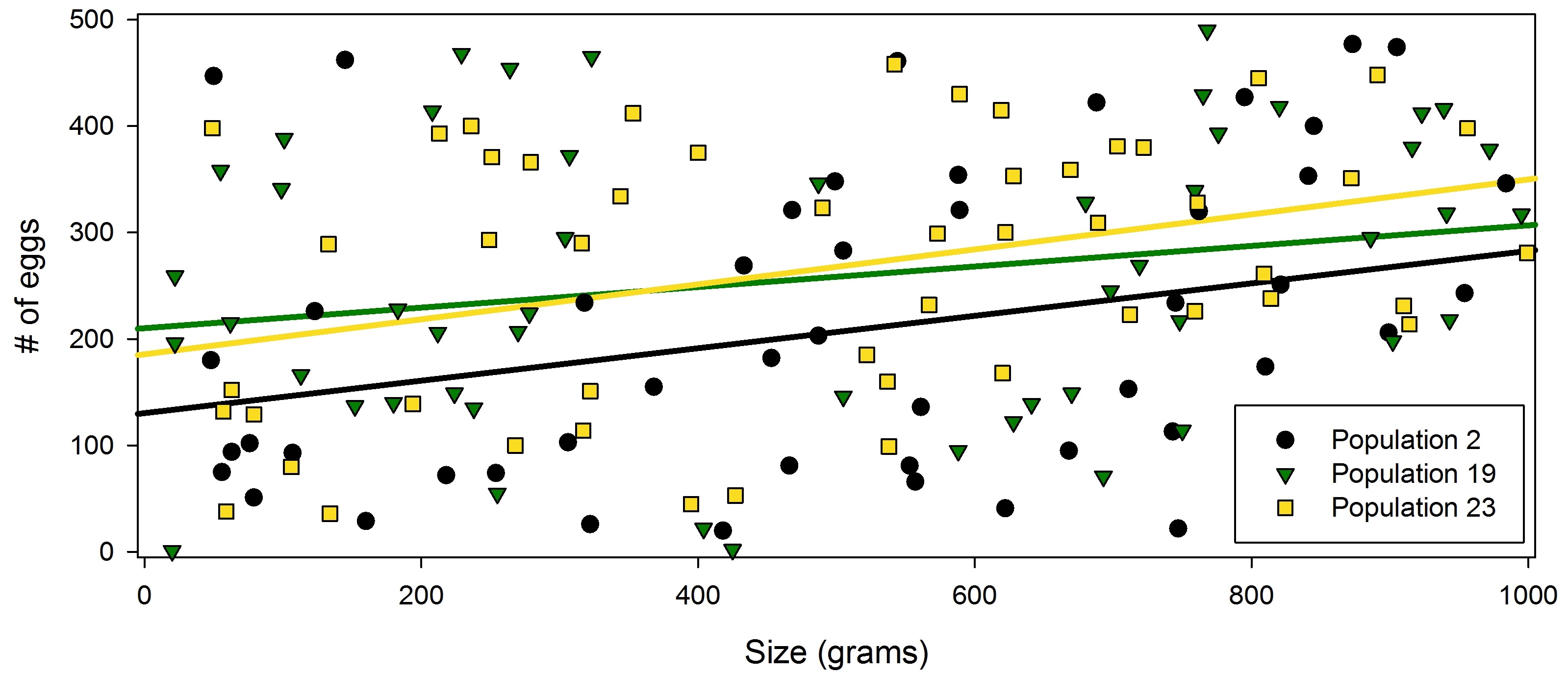 That’s obviously a bit of a mess to look at, but a few of those lines appear to be showing a relationship, and when we run a Spearman rank test on each subset, we find that populations 2, 19, and 23 all had a significant positive relationship between frog size and clutch size!