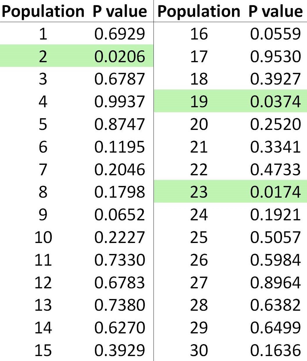 Table 1: P values for all 30 fictional populations. Anything less than 0.05 was considered statistically significant. The three significant populations have been highlighted.