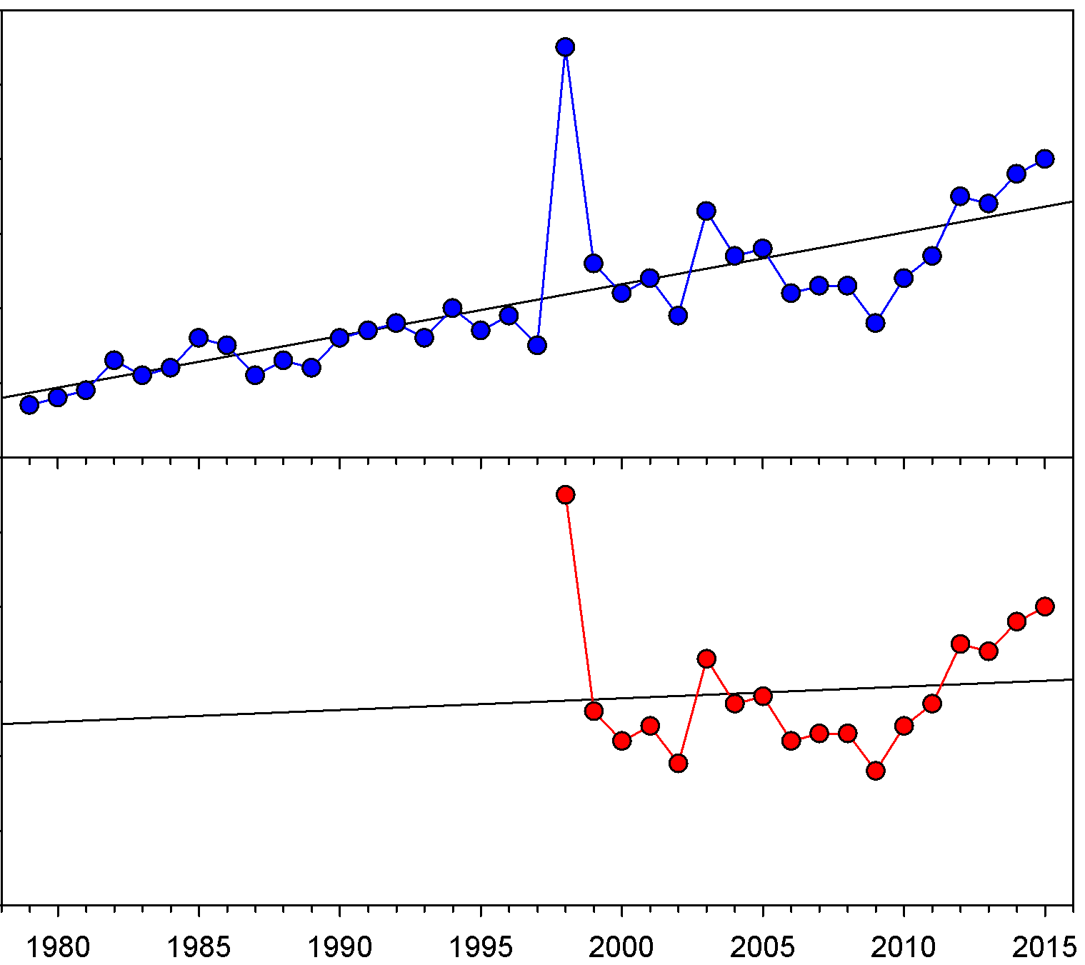 Finally, let’s turn to a very important source of data: the oceans. Our oceans are massive heat sinks. Indeed, it’s estimated that over 90% of the excess energy that the earth has trapped via global warming is stored in the oceans (Rhein et al. 2013). This is because water has a very high heat capacity, which makes it excellent at absorbing and storing heat energy. So, what’s happening to our oceans? Quite simply, they are trapping more heat energy (Balmaseda et al. 2013; Glecker et al. 2016). Look, for example, at Figure 1 in the Balmaseda et al. study or Box 3.1 (page 262) of Rhein et al. (2013)(left). Yes, there are fluctuations, and in Balmaseda et al. you can see a large peak around 1998 (just like all of the other data sets), but there is also a very clear upward trend. In other words, the oceans are continuing to trap more and more heat.