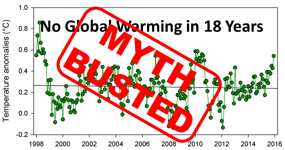 The notion that there has been a recent pause or hiatus in global climate change is one of those myths that just will not die. Numerous studies have shown that it simply isn’t true, and the claim is based on cherry-picked evidence and shoddy statistics. Nevertheless, despite 2015 replacing 2014 as the warmest year on record (based on surface temperature data), the myth lives on. Therefore, I want to provide a simple explanation of why this argument is fraudulent, as well as briefly reviewing several fairly recent studies that have thoroughly demolished the myth of the global warming pause. In short, the “pause” is actually just a normal fluctuation, and there have been multiple similar “pauses” prior to this one. There is nothing truly unique or special about the past two decades, and the climate is still warming.
