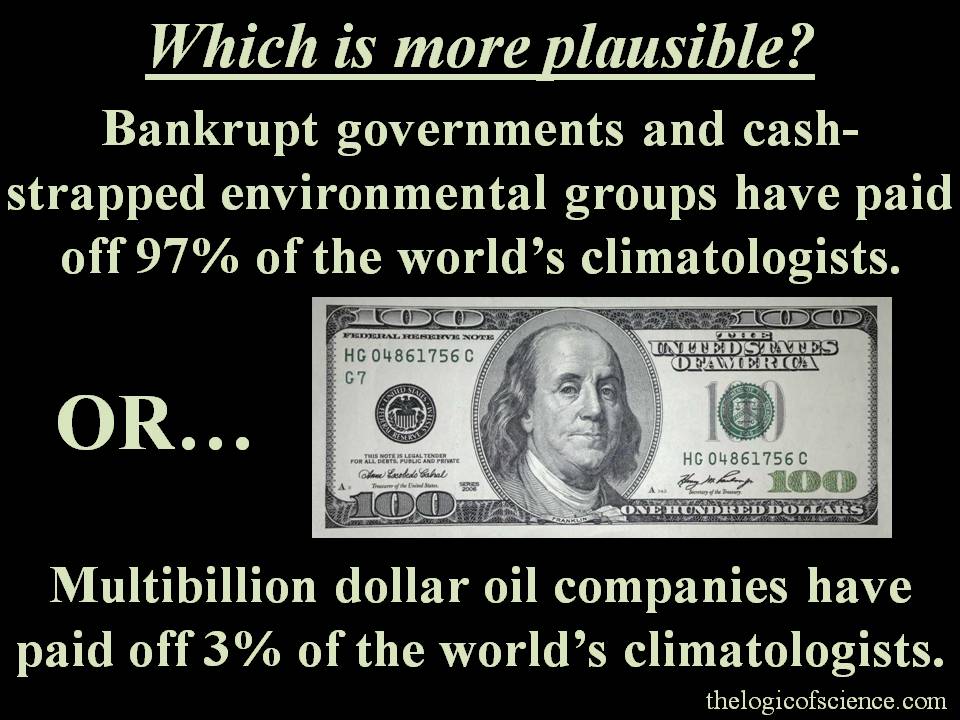 Reality: These are ad hoc fallacies (i.e., unless you provide actual evidence that they are corrupt, these claims are baseless assumptions). Additionally, if we are going to go down this road, then let’s flip things upside down and ask the opposite question: who would benefit from opposing climate change research? The answer to that question is pretty obvious: oil companies. If scientists could really be bought off so easily, then why haven’t multi-billion-dollar oil companies been able to buy off more than a handful of them? Given the vast wealth of oil companies, the millions of dollars that they have poured into denialist organizations, and the economically unstable state of most governments, surely oil companies could offer scientists more than governments could.