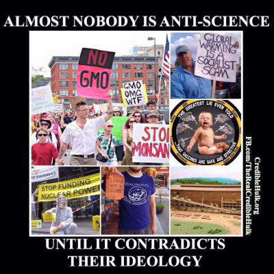 For example, on several occasions, I have seen people criticize anti-vaccers for appealing to the authority of a few fringe “experts.” Then, a few threads later, I see those same people appealing to the authority of a few fringe experts on topics like climate change and GMOs. Similarly, I see people ridicule climate change deniers for thinking that all climatologists have been bought off, but when the topic shifts to GMOs, suddenly those same people start claiming that Monsanto has bought off all of the world’s genetic engineers/food scientists. Do you see what I am getting it? You can’t criticize someone for using a particular line of reasoning, then turn around and use that same line of reasoning to support your own particular form of science denial. That’s not logically consistent, and it’s not how science operates. Science is a method. It either works or it doesn’t, and you can’t cherry-pick when to accept it.