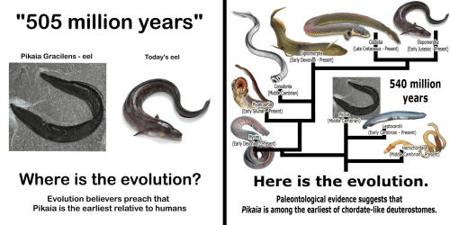 On the left you have a creationist meme arguing that Pikaia gracilens is the same as a modern eel. In reality, it is very different from a modern eel, and as is depicted on the right, there were many other lineages that evolved into our modern animals. The image was made by Here’s The Evolution, a Facebook page devoted to refuting creationists’ non-sense memes.