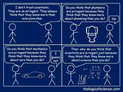 Just as we would not accept a paper that said “I have perfected time travel. Here is an artifact from the future. Trust Me.” So too, the lay people hold us to that same standard when we speak or write to them. Far too often, the approach is to simply write off the lay persons study and research (instead of helping them look at it critically so they can understand both the facts and flaws of their work). Then from their perspective we appear to say “Trust me I know because I am a scientist.” Which makes us look like the biggest hypocrites of all times. After all, we demand sound arguments supported by valid evidence before giving weight to an idea, but we refuse to provide the same to lay people in a way they can understand.