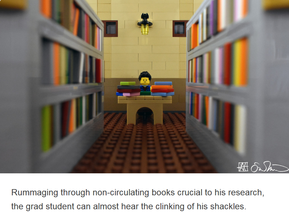 Lego Grad Student is one of the most entertainingly accurate representations you’ll ever see of what it is like to be a graduate student. It is one of my few sources of joy in life, and I highly recommend that you follow him on facebook, twitter, etc.