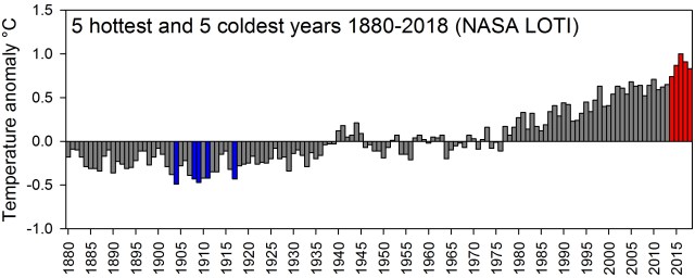 Climate change is based on scientific facts and evidence, not politics or ideology, and it is an incontrovertible fact that the planet is warming. Nevertheless, many people continue to deny this reality (although polls suggest that their numbers are shrinking). The recent polar vortex, for example, was frequently touted as evidence that global warming is not happening. The actual data, of course, paint a very different picture. NASA has just released its final 2018 data for its comprehensive global Land-Ocean Temperature Data set, and the data very clearly show that the planet is on a warming trajectory. Indeed, all five of the five hottest years on record have occurred in the past five years. Sure, there have been cold spells and winter storms during those years, but those are weather events, not climate trends. Indeed, climate change never predicted that there wouldn’t be cold winters or blizzards. Rather, the prediction always has been that the mean temperature will increase, along with other changes like increased floods in some areas, increased droughts in others, etc. (all of which are coming true).