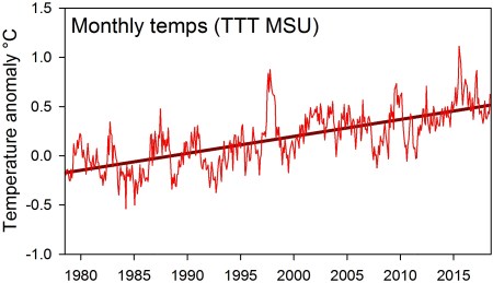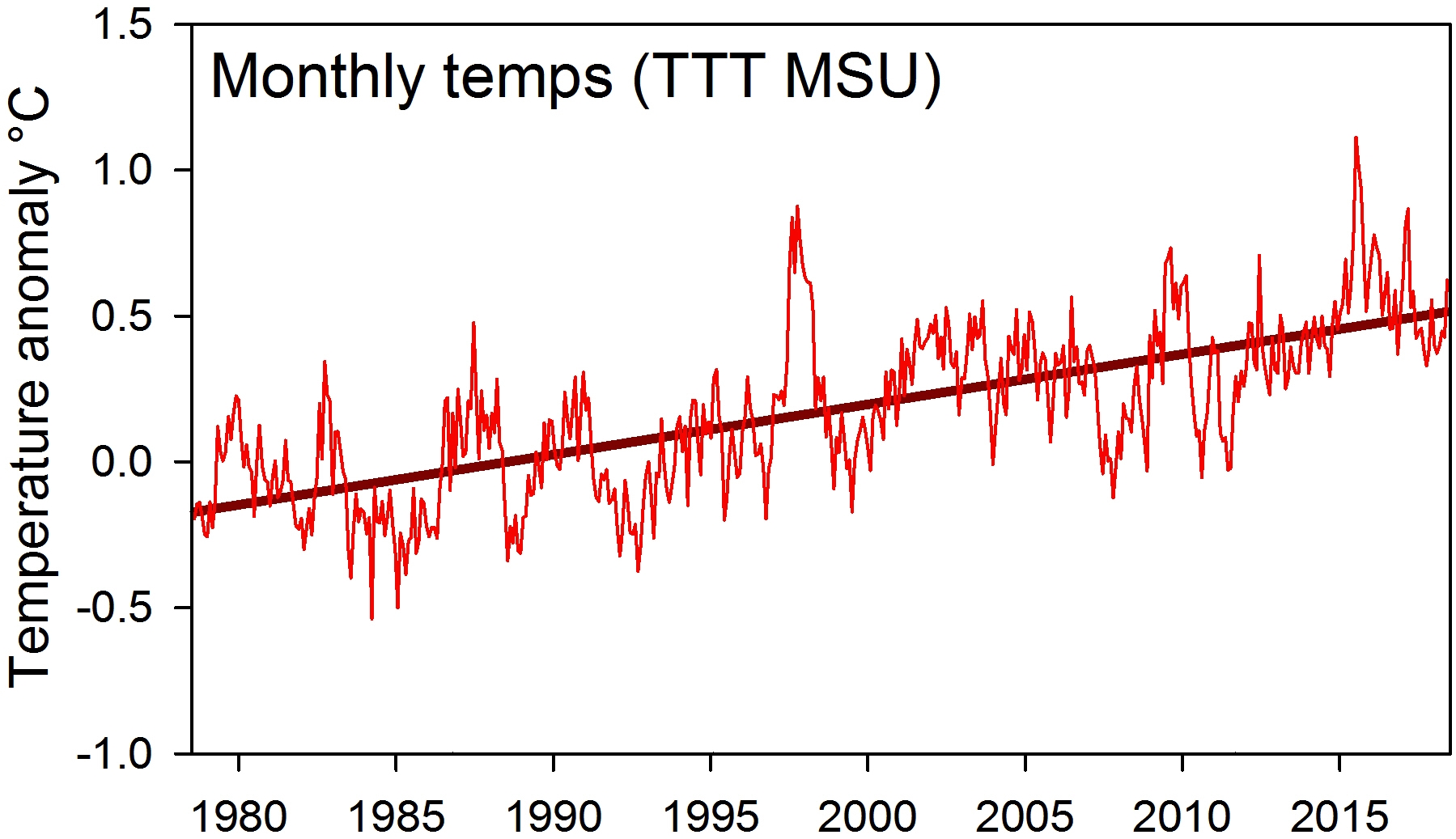 Data from the RSS/MSU satellite data set (TTT). Notice the massive El Niño spike at 1998. Climate change deniers like to cherry pick that as the starting point for their claim that global warming has paused. When you look at the full data set, hopefully you can see why that is invalid cherry-picking. The full data set clearly shows a warming trend. These data are monthly.