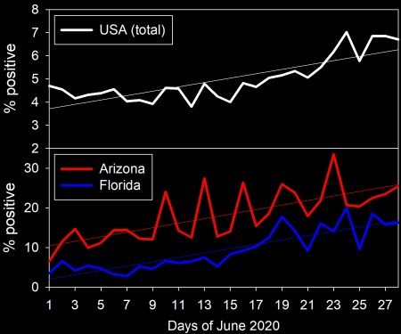 Now, with all of that in mind, let’s look at coronavirus in the US. If the situation is truly improving and the actual number of cases is truly decreasing and the apparent recent increase in cases is just a result of increased testing, as many argue, then we should see that the percent of tests that are positive has continued to decrease. That is not, however, what we see. It was decreasing for a while, but if we look at June (when things have been opening back up and when the spike in cases occurred) we see a statistically significant (P < 0.0001) increase in the percentage of tests that are positive (Figure 2). In other words, the increase in tests simply cannot explain the entirety of the increase in cases. It probably is a contributing factor, but the actual the actual number of coronavirus cases in the US is actually going up rapidly. That is a fact. To be clear, exactly what is happening varies by states, and some cases are experiencing decreases in the rates of positive tests, but many others are experiencing sharp increases, particularly in states like Florida and Arizona (Figure 2). They are very much experiencing viral outbreaks (Johns Hopkins has some very nice data and graphs for state data that I recommend looking at)..
